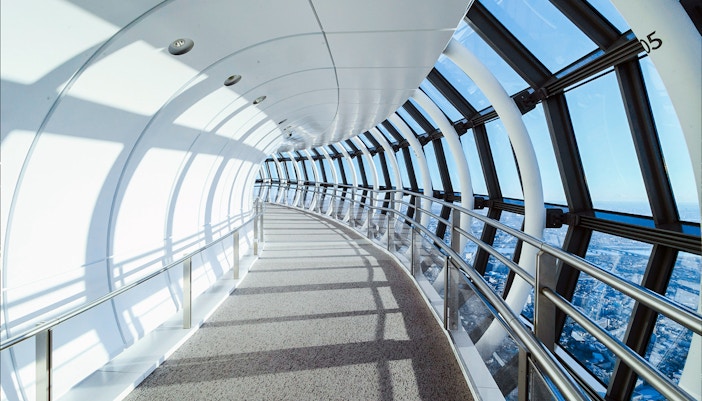 A gently sloping glass ramp wraps around the tower, offering 360° views as you ascend.