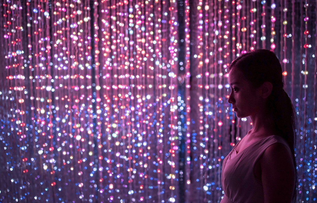Los espejos que van del suelo al techo, las luces sincronizadas y el sonido ambiente se combinan para crear la sensación de estar dentro de una galaxia simétrica e ilimitada.