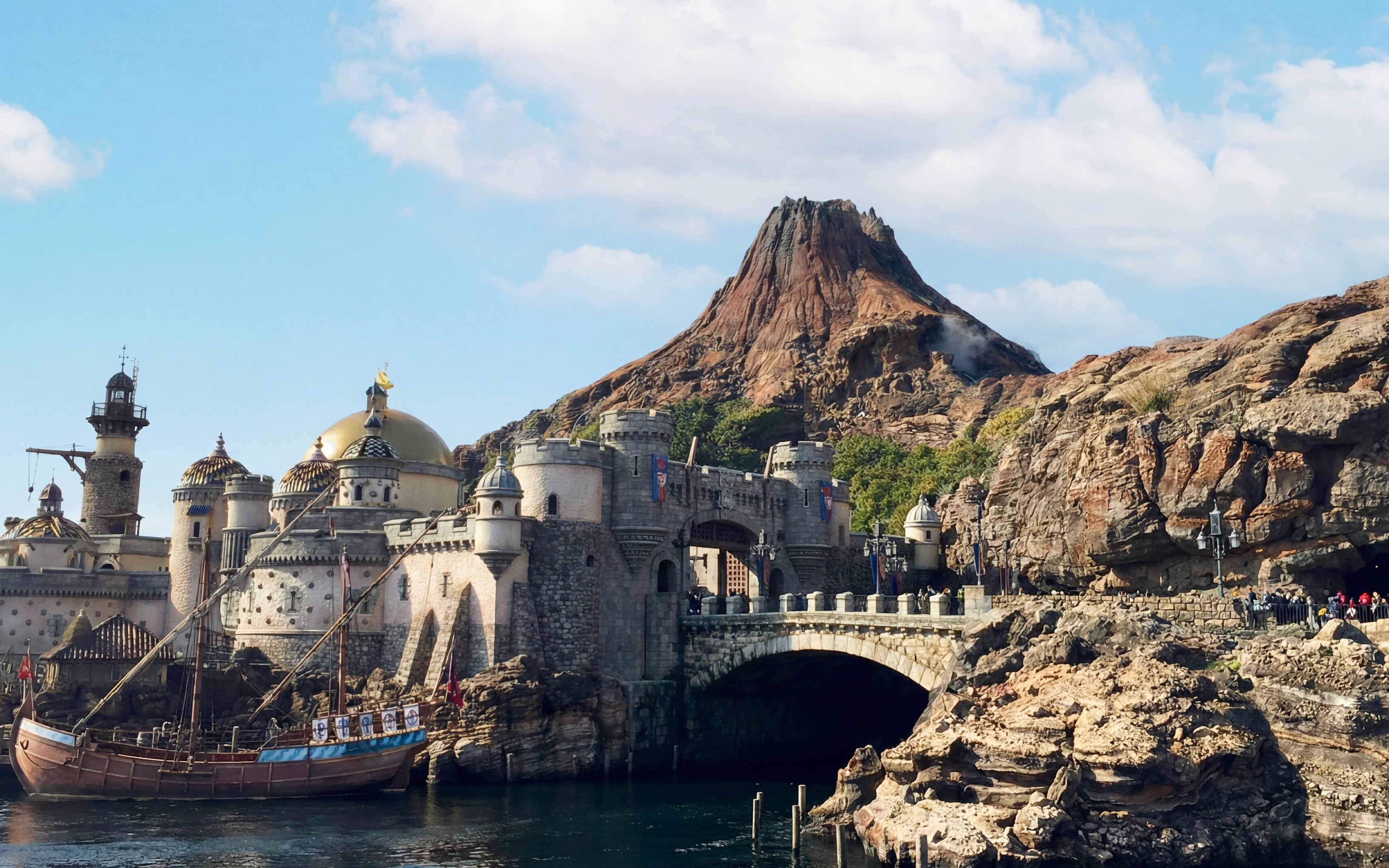 Tokyo DisneySea adopte une approche architecturale différente. Plutôt que de s'articuler autour d'un château central, le parc s'organise autour du mont Prométhée, un imposant volcan qui sert à la fois de point de repère visuel et d'emplacement à plusieurs attractions. Chaque escale, du port méditerranéen à la côte arabe, fait appel à une architecture soigneusement conçue, à des aménagements rocheux et à des cours d'eau pour recréer l'atmosphère de véritables villes côtières et de mondes fantastiques.
