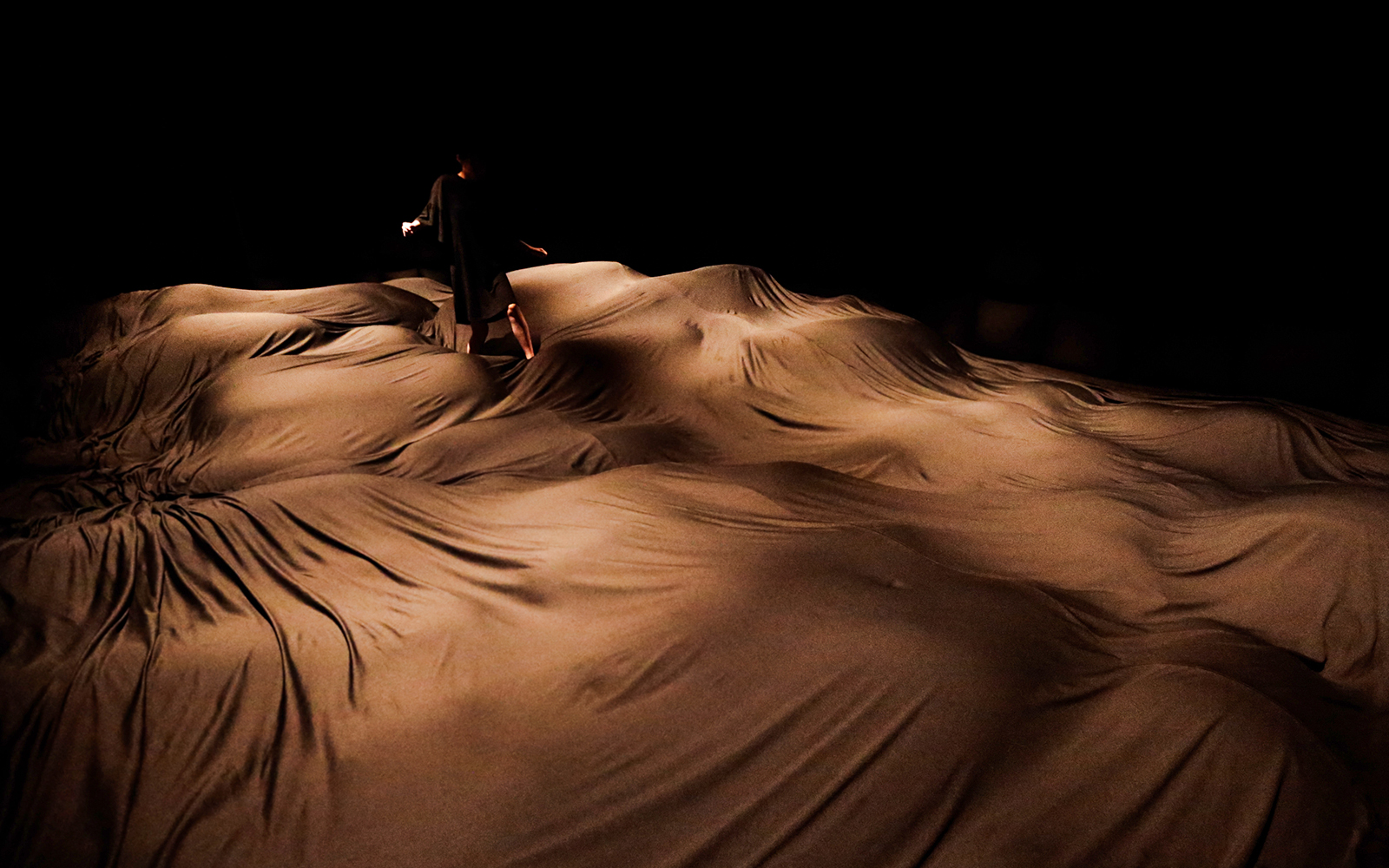 La chambre est faiblement éclairée et remplie de monticules en forme d'éponge qui cèdent sous les pieds ou le poids du corps. Les ombres et la douceur se combinent pour créer un paysage surréaliste où vos sens se recalibrent à chaque pas instable.
