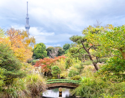 Historic garden in Sumida with over 200 plant species and stone monuments linked to classical poetry, plus framed views of Skytree.