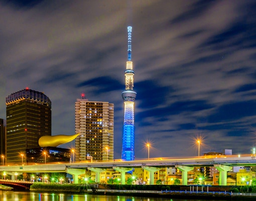Stroll along the illuminated riverbanks, with Skytree’s colorful lights reflected in the water.