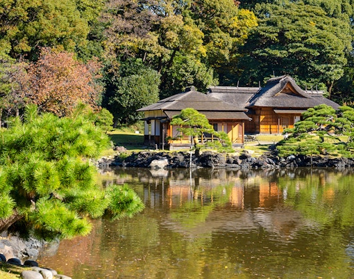 Edo-period landscape garden with tidal ponds, a tea house, and seasonal flower displays,