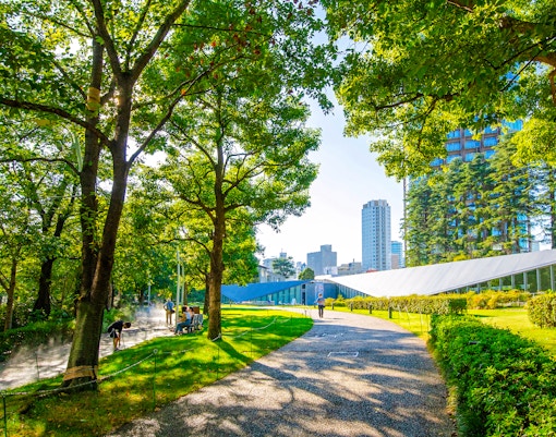 Modern Japanese garden with a pond, bamboo groves, and playground, located near Roppongi Hills.